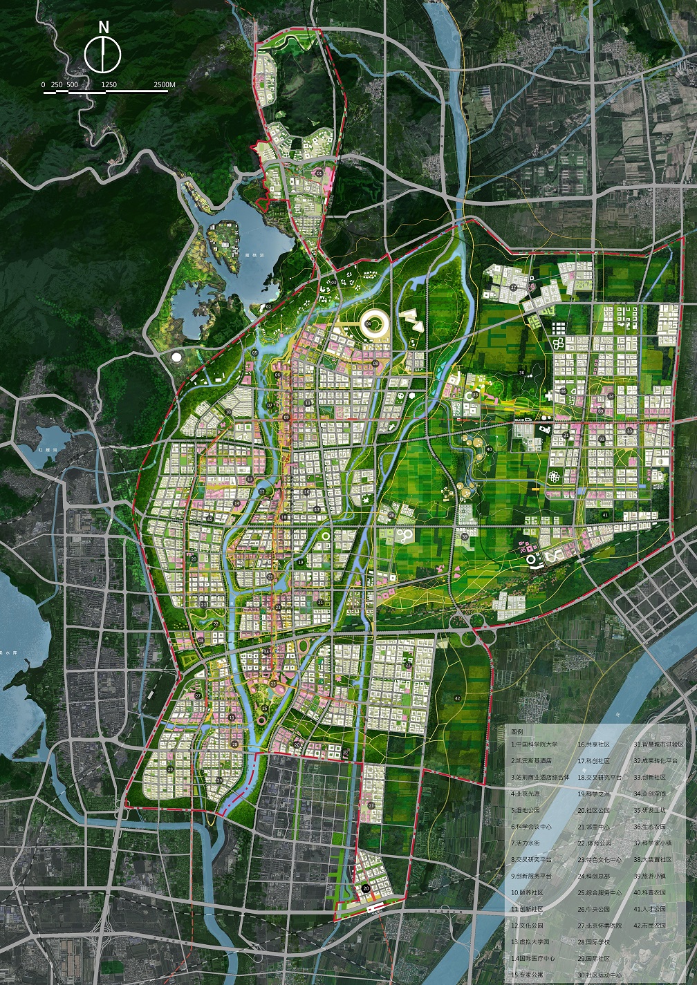 Huairou Science City is positioned as a world-class strategic scientific innovation highland, with basic scientific research as its core mission to promote civilization progress. The total land area is 100.9km2, and developable land is about 40km2.